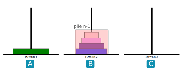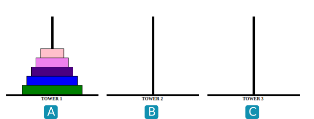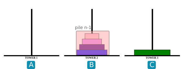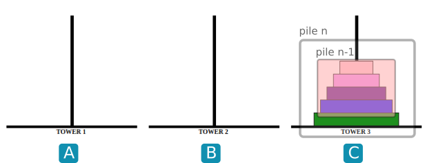 Le but est de faire passer toutes les assiettes de A vers C, sachant qu'une assiette ne peut être déposée que sur une assiette de diamètre inférieur.
