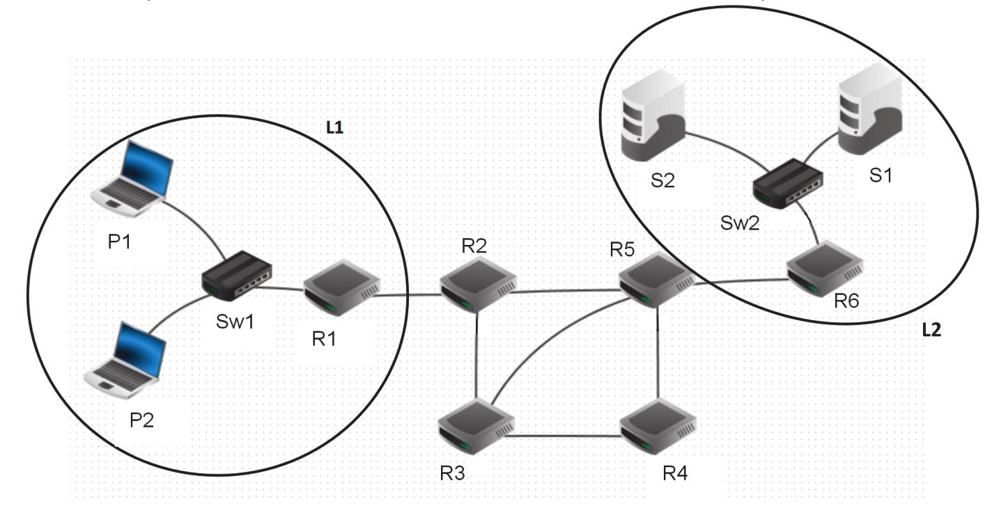 La figure 1 ci-dessus représente le schéma d’un réseau d’entreprise. Il y figure deux réseaux locaux L1 et L2. Ces deux réseaux locaux sont interconnectés par les routeurs R2, R3, R4 et R5. Le réseau local L1 est constitué des PC portables P1 et P2 connectés à la passerelle R1 par le switch Sw1. Les serveurs S1 et S2 sont connectés à la passerelle R6 par le switch Sw2.