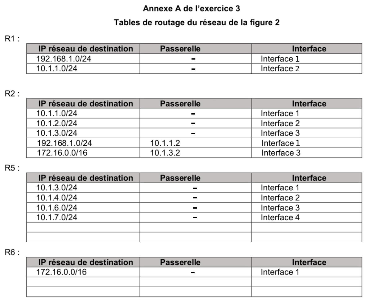 3/ Dans l’annexe A figurent les tables de routages des routeurs R1, R2, R5 et R6 au démarrage du réseau. Indiquer sur votre copie ce qui doit figurer dans les lignes laissées vides des tables de routage des routeurs R5 et R6 pour que les échanges entre les ordinateurs des réseaux L1 et L2 se fassent en empruntant le chemin le plus court en nombre de sauts.